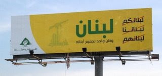 Die Hizbollah scheint gar nicht sehr bestrebt auf ihrem Wahlplakat selbst in Erscheinung zu treten. Neben den rot durchgestrichenen Worten "Euer Libanon, Unser Libanon, Ihr Libanon" steht groß "Libanon". Darunter der Satz "Eine Nation für all ihre Söhne". Das Logo der Partei hebt sich kaum vom gelben Grund des Plakats ab.
