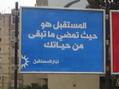 Die Mustaqbal-Bewegung (Future Movement) spielt mit ihrem Namen und wirbt mit dem Slogan: "Die Zukunft ist dort, wo du den Rest deines Lebens verbringst."