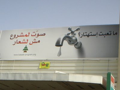 Die Kataeb zeigen einen tropfenden Wasserhahn und fragen: "Hast du nicht genug von der Sorglosigkeit?" Des weiteren empfehlen sie: "Wähl das Programm, nicht für einen Slogan!"